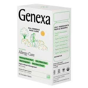 Genexa Allergy Care is a real remedy, made clean - addressing symptoms associated with hay fever or other respiratory allergies*. Each chewable tablet has the same healing ingredients you need (organic homeopathic blend), but without the artificial ones you don’t (artificial dyes, common allergens, parabens). Founded by two dads on a mission to clean up the medicine aisle, Genexa only uses clean ingredients to make certified organic, gluten-free, non-GMO homeopathic medicines. It’s what people deserve.