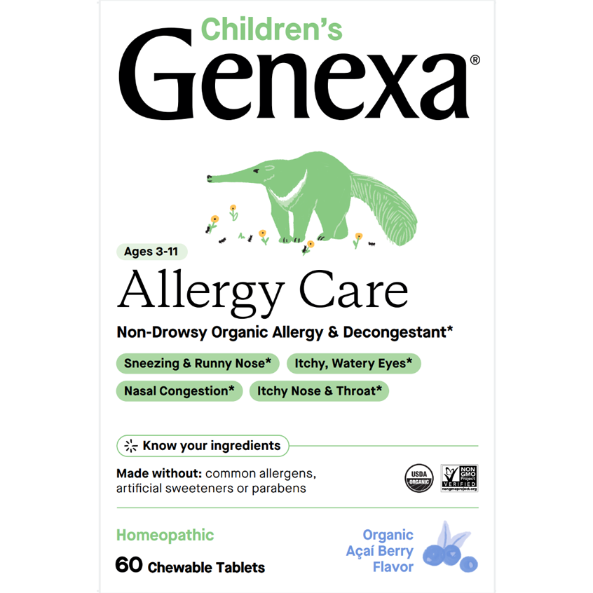 Genexa Kids’ Allergy Care is a real remedy, made clean - addressing symptoms associated with hay fever or other respiratory allergies*. Each chewable tablet has the same healing ingredients you need (organic homeopathic blend), but without the artificial ones you don’t (artificial dyes, common allergens, parabens). Founded by two dads on a mission to clean up the medicine aisle, Genexa only uses clean ingredients to make certified organic, gluten-free, non-GMO homeopathic medicines. It’s what little ones deserve.
